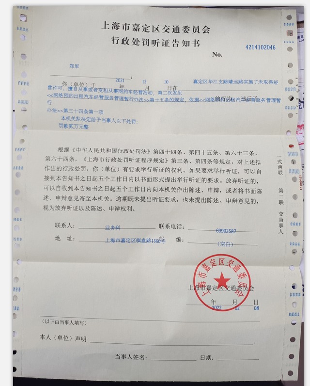 我大队于2022年02月08日对你作出《上海市嘉定区交通委员会行政处罚听证告知书》(编号:4214102046),因无法直接送达、留置送达及邮寄送达,根据《交通运输行政执法程序规定》第十八条第五项的规定,依法向你公告送达《上海市嘉定区交通委员会行政处罚听证告知书》(编号:4214102046)。请你于本公告发布之日起三十日内前往上海市嘉定区交通委员会执法大队(地址:上海市嘉定区棋盘路1560号)领取《上海市嘉定区交通委员会行政处罚听证告知书》(编号:4214102046),否则,自公告发布之日起经过三十日,即视为送达。