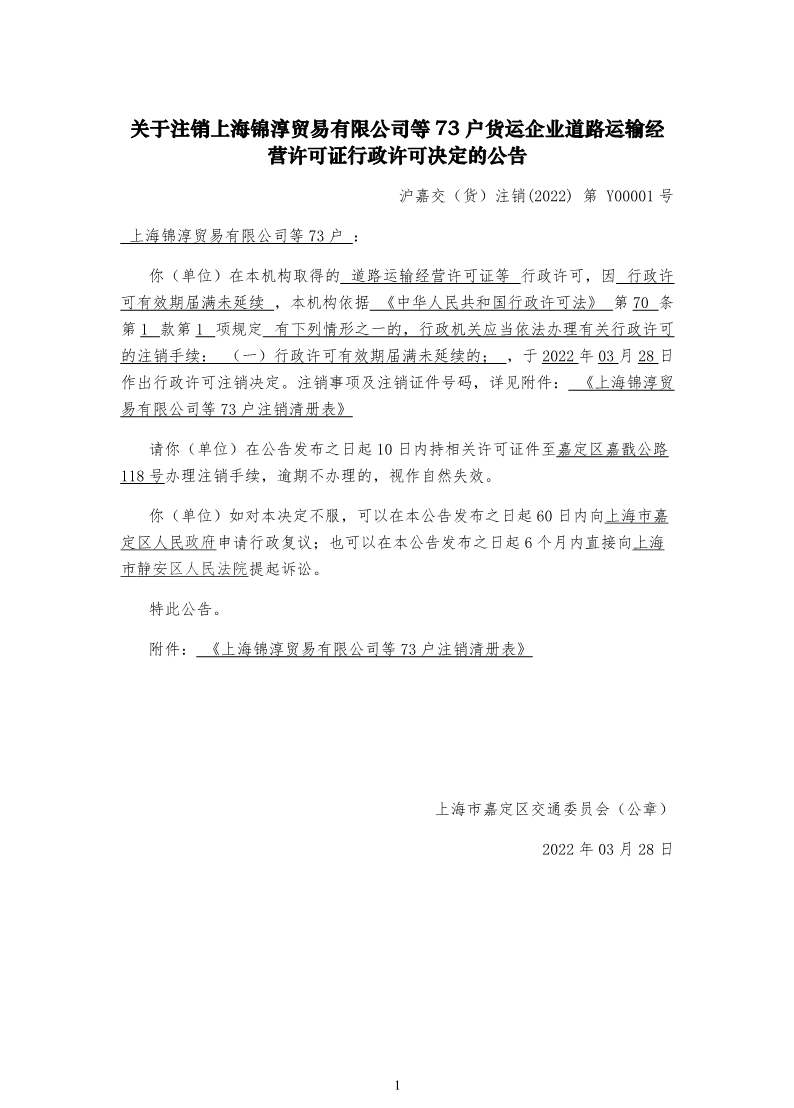 索引号: 00001434-9/2022-00290 发布机构: 区交通委 发文日期: 2022年03月28日 主题分类: 政务公告 关键词: 关于注销上海锦淳贸易有限公司等 73 户货运企业道路运输经营许可证行政许可决定的公告 发布时间:2022-03-28 浏览次数: 次 【字体:小 大】 202203281223280794.pdf